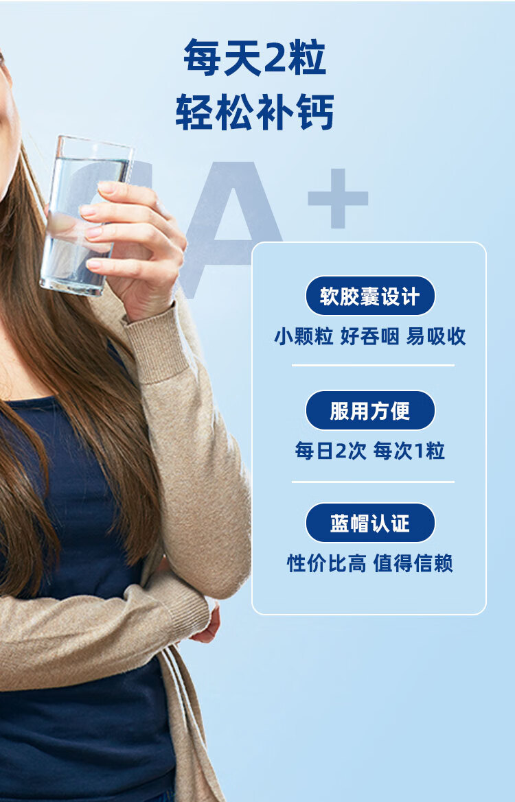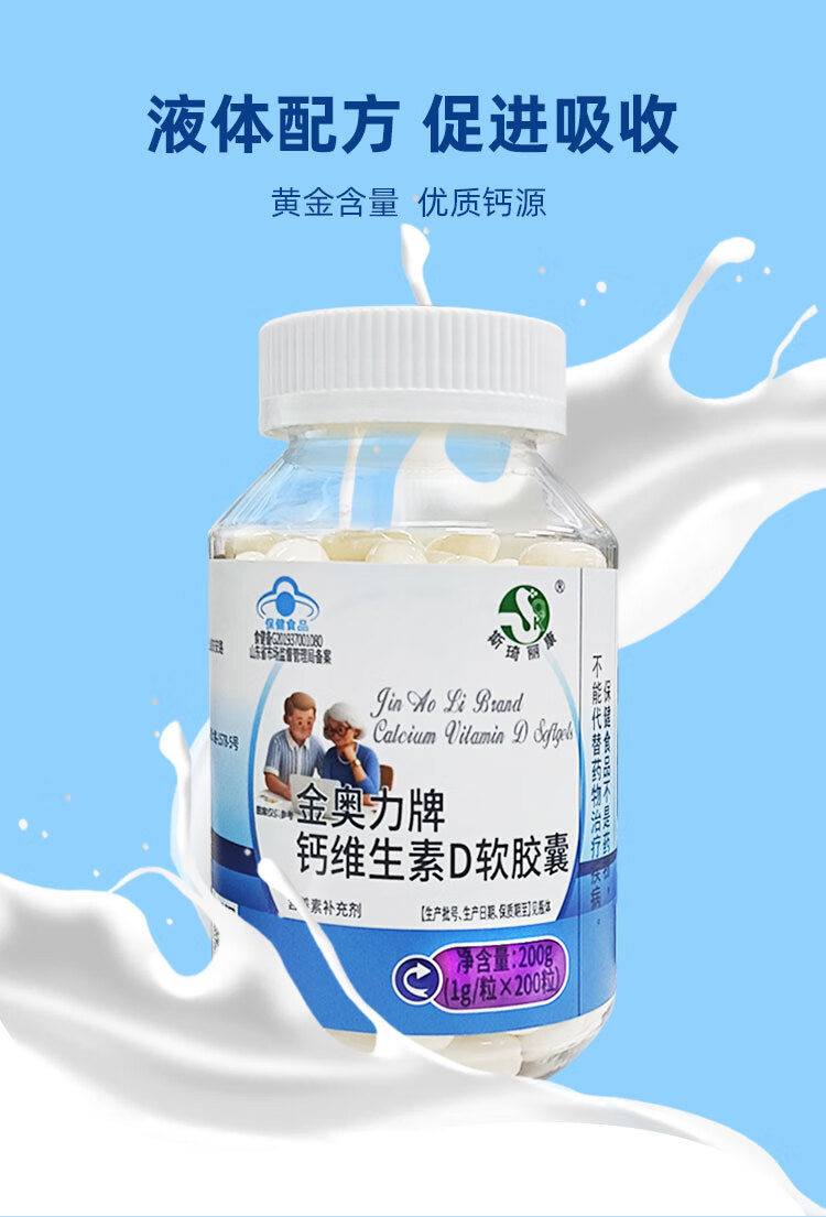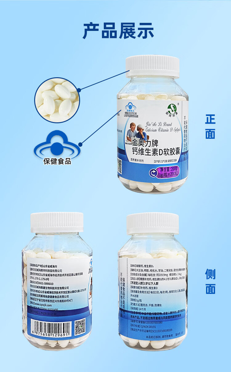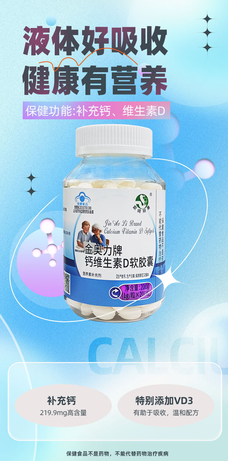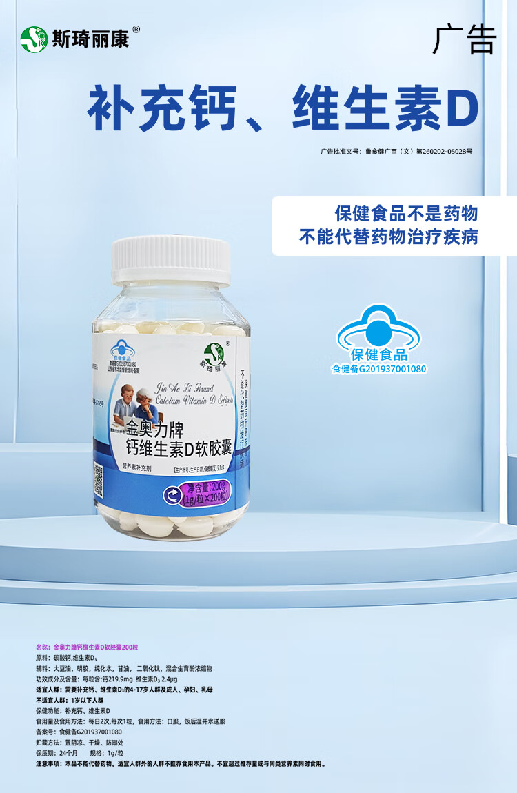 斯琦丽康钙维生素D软胶囊蓝帽 200粒【小瓶装100天】