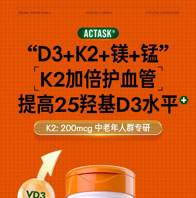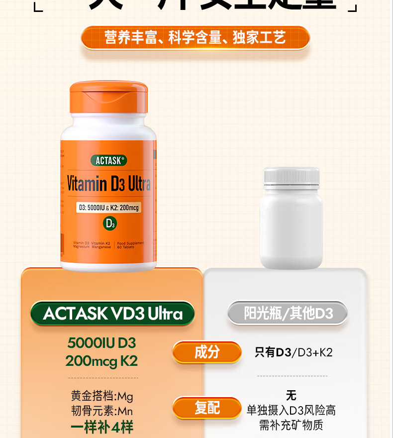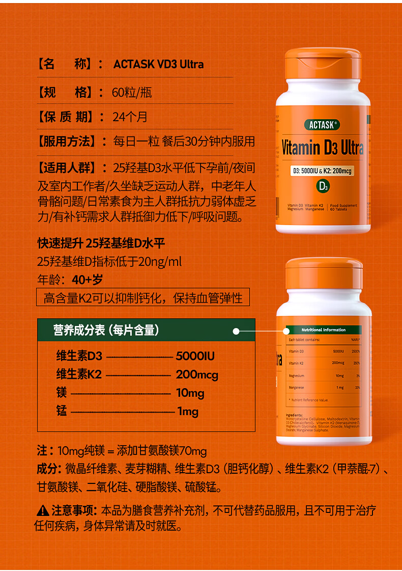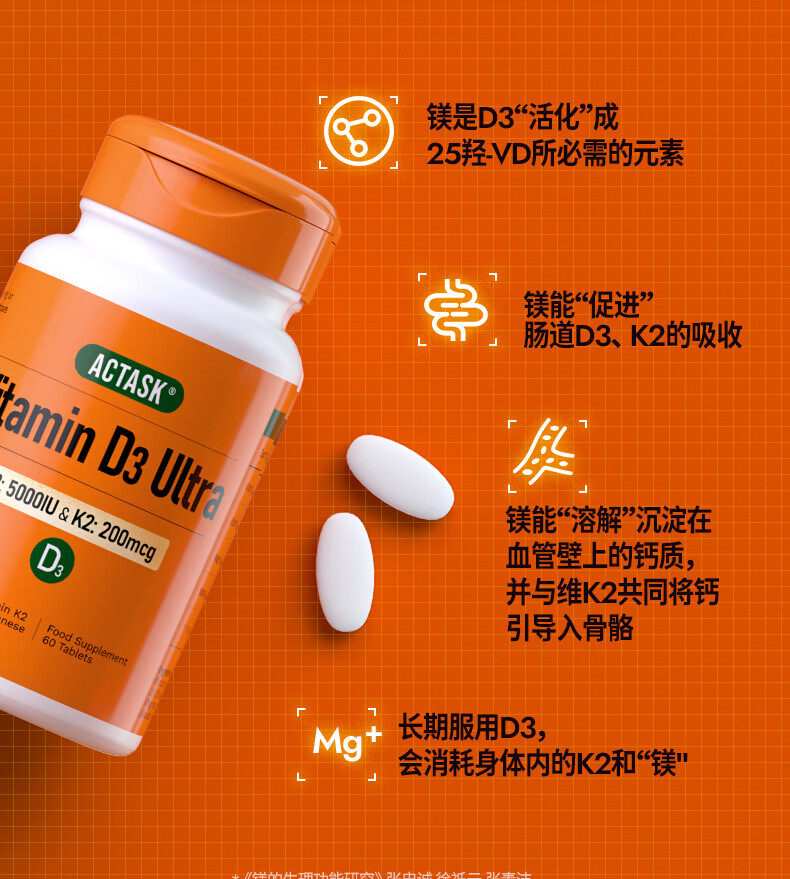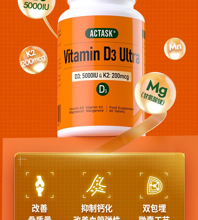 ACTASK【D3Ultra】5000iu维D3+200mcgK2+镁3合1维护心血管提升免疫力 60粒*1瓶 【推荐周期服用拍3瓶】 【抑制钙化/骨质疏松】3瓶